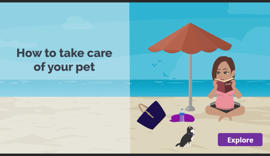 The first video is Part I of the Pitu the Dog series, which has my dog as the star. Part II, for which I included screenshots, is a microlearning which walks you through information on How to take care of your pet. I designed this series as a personal professional development project to use the new Vyond motion paths and its integration with Articulate Storyline 360.